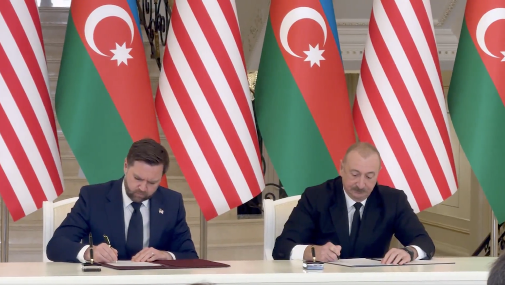 U.S. Vice President JD Vance and Azerbaijan President Ilham Aliyev sign a strategic partnership charter during Vance’s February 2026 visit.